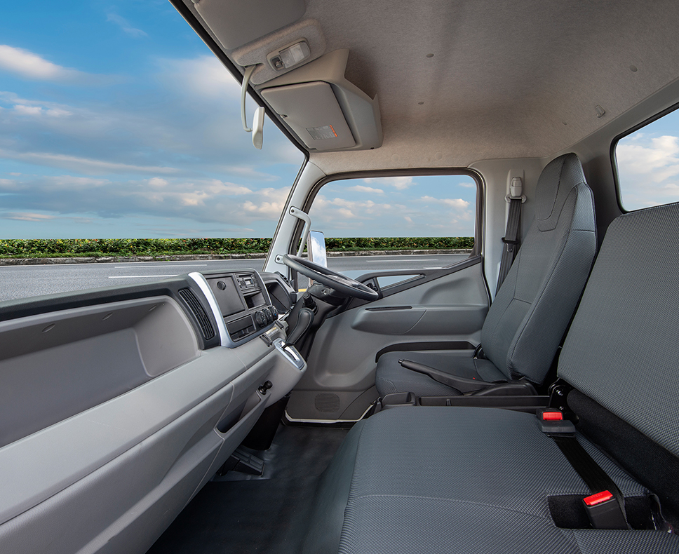Com a sua alavanca de velocidades de curso curto montada no painel de instrumentos e a sua coluna de direção elevada, há espaço suficiente para acomodar três pessoas confortavelmente no habitáculo. A transmissão DUONIC™ oferece as mudanças de velocidade suaves de uma transmissão automática com todo o controlo de uma transmissão manual. O FUSO CANTER LIFT faz o trabalho de um camião, mas conduz-se como um carro. Os vidros elétricos estão disponíveis em modelos selecionados, mas o ar condicionado e o rádio/leitor de CD são itens de série. A grelha frontal do FUSO CANTER LIFT apresenta faróis de halogéneo envolventes com indicadores de mudança de direção transparentes das lentes. Os faróis de nevoeiro dianteiros são também itens de série em todos os modelos.